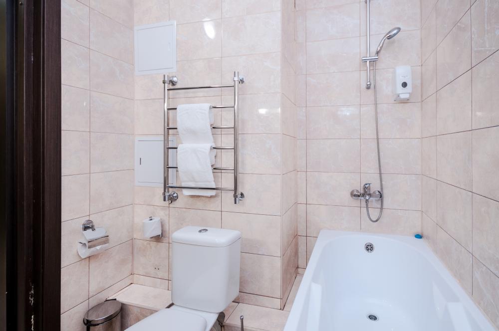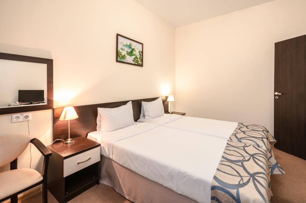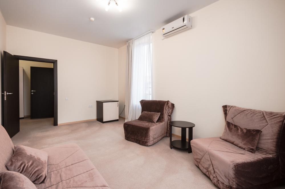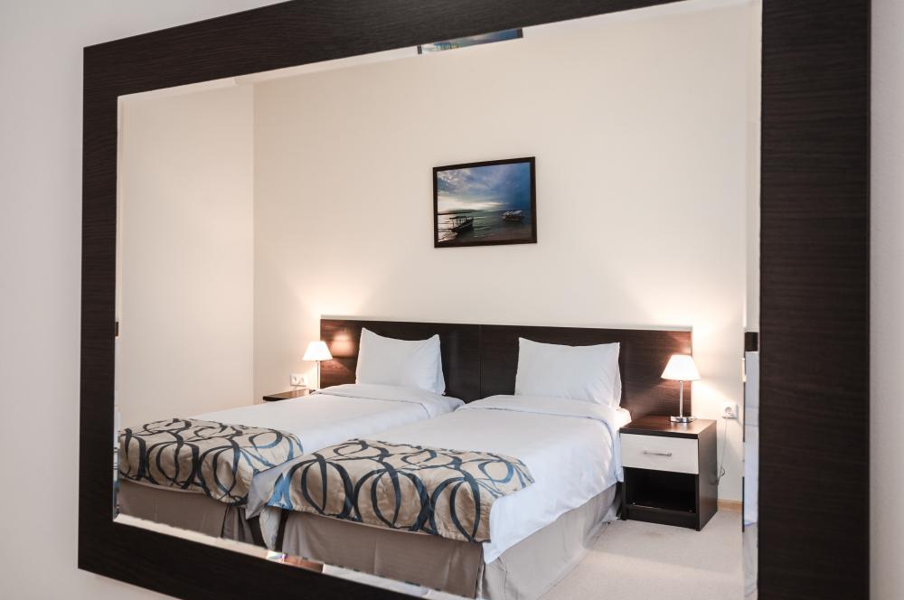 Трехкомнатный люкс имеет две спальни и гостиную. Его общая площадь составляет 65 квадратных метров. В гостиной находится мягкий уголок, а в спальнях по 2 кровати размером 90*200 см. Для комфорта проживающих номер оснащен современной техникой. В каждой комнате установлен кондиционер, интернет, в одной из спален есть телевизор, мини-бар для напитков, фен. Санузел совмещенный.